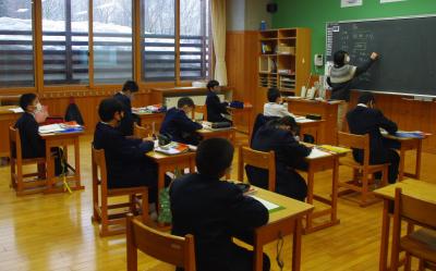 中学校1・2年は火曜と木曜は体育の授業として午後のスキーを、水曜は部活動として午後のスキーを行っています。アルペンとクロスの競技場に向かうバスを、中学校3年生が見送っています。