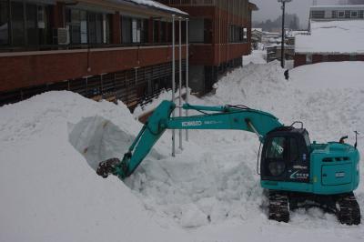 中学生全員で雪囲いやネットを校舎周りに設置しています。中学生のがんばりのおかげで、雪の備えができています。