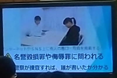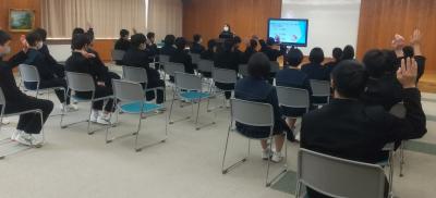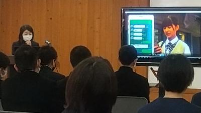 情報モラル教室 白山署生活安全課の方からお話をしていただきました。SNS等で他人を誹謗中傷すると、場合によっては名誉毀損罪や侮辱罪になることなど、事例を通して生徒たちは学んでいます。