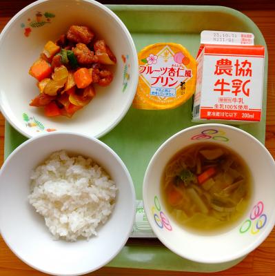 今日の献立は、「ごはん・牛乳・酢豚・ごぼうと白菜のスープ・フルーツ杏仁プリン」です。酢豚にはじゃがいもの角切りを素揚げしたものを入れています。ホクホクしておいしく、ボリュームもアップします。
