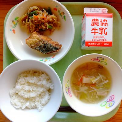 今日の献立は、「ごはん・牛乳・鯖のたつたあげ・切干大根炒り煮・白菜とさつまあげのみそ汁」です。