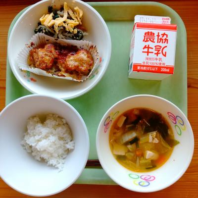 今日の献立は、「麦ごはん・牛乳・ミートボールのハヤシライス・フルーツ杏仁」です。今日は、ミートボールを給食室で1つ1つ手作りし、身がくずれないようにスチコンで焼いてからシチューに入れました。とてもおいしかったです。
