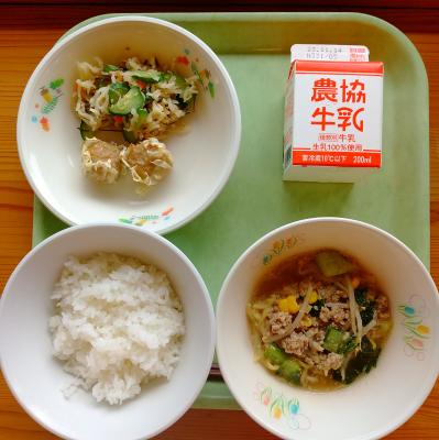 今日の献立は、「ごはん・牛乳・ポークシューマイ・切干大根の中華漬物・担々麵」です。切干大根は、歯ごたえを残すように加熱し冷却して和え物にしました。カミカミ献立です。