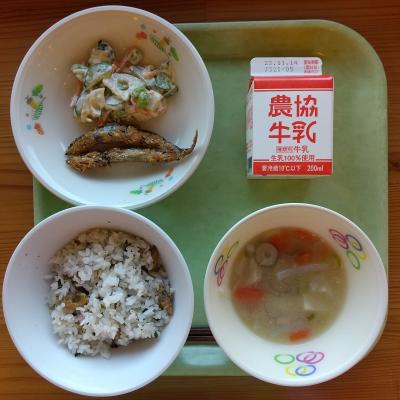今日の献立は、「鉄骨ごはん・牛乳・ししゃもの石垣フライ・れんこんサラダ・とりごぼう汁」です。