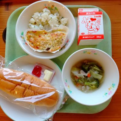 今日の献立は、「コッペパン・牛乳・鮭のグラタン・ペルナムッシ・シスコンマッカラケイト・いちごジャム」です。