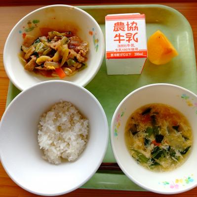 今日の献立は、「麦ごはん・牛乳・豚キムチ風炒め・コーンかきたまスープ・柿」です。季節の果物「柿」をいただきました。甘柿です。給食室で1個1個皮をむき、1/4カットしました。とってもおいしかったです。