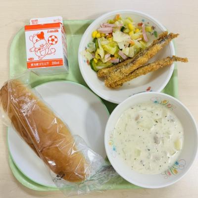 今日の給食は「コッペパン・牛乳・ししゃもフライ・はちみつレモンサラダ・クリームシチュー」です。