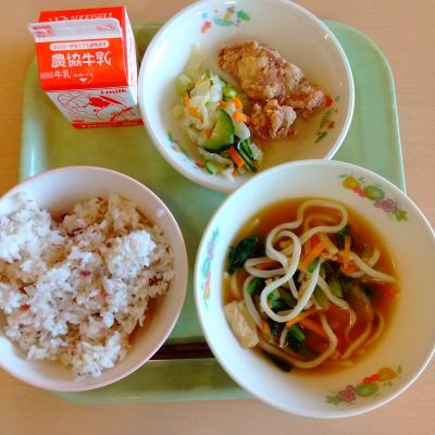 今日の給食は、「梅ごはん・牛乳・フライドチキン・香味あえ・冷やしうどん」です。蒸し暑い日が続いているのでサッパリした献立にしました。2学期になって初めての給食でしたが、みんなモリモリ食べました!