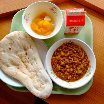 今日の給食は、「ナン・牛乳・キーマカレー・白山梨のフルーツポンチ」です。みんなはカレーが大好きです。