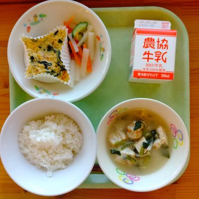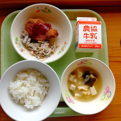 今日の給食は「ごはん・牛乳・トンカツ・ごぼうのゴマネーズあえ・豆腐とわかめの味噌汁」です。トンカツはヒレ肉で作ったので、やわらかくて とってもおいしかったです。サラダには、ひじきやごまが入っているので鉄たっぷりです。