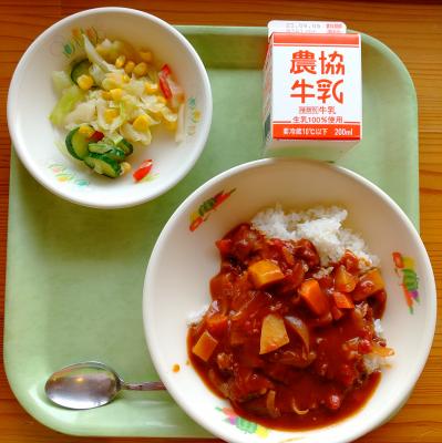 今日の給食は「麦ごはん・牛乳・トマトのハヤシライス・コーンサラダ」です。今日のハヤシライスには、生のトマトを湯むきしてカットしたものが たっぷり入っています。なので・・ちょっと酸味がきいています。