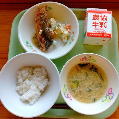 今日の給食は「ごはん・牛乳・千草焼き・彩り野菜のピクルス・あつあげのみそ汁」です。