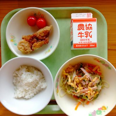 今日の給食は「白ごはん・牛乳・香味チキン・ミニトマト・冷やし中華」です。香味チキンには、下味にカレー粉をまぶして唐揚げにしてからタレにからめました。味がしっかりついていておいしかったです