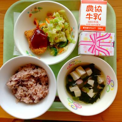 今日の給食は「赤飯・牛乳・ヒレカツ・ツナサラダ・紅白すまし汁・お祝いデザート」です。