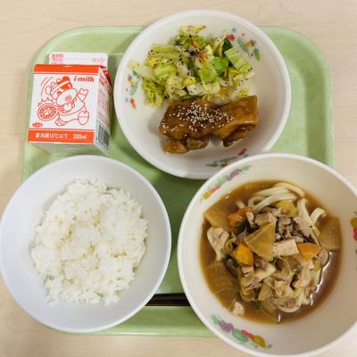今日の献立は「ごはん・牛乳・鶏肉の甘辛たれ・キャベツのゆかり和え・みそ煮込みうどん」です。