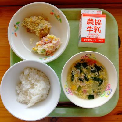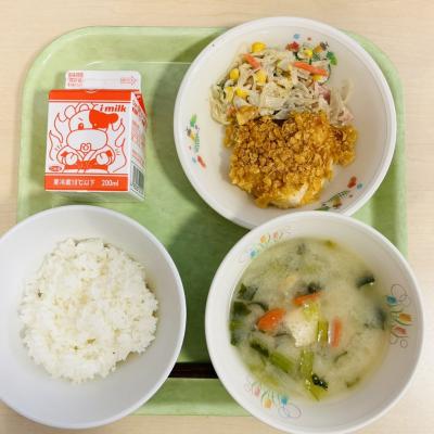 今日の給食は「ごはん・牛乳・マヨチキンのフレーク焼き・ごぼうサラダ・あつあげと小松菜のみそ汁」です。
