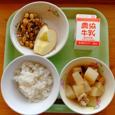 今日の給食は「麦ごはん・牛乳・大豆と小魚のあげからめ・みそおでん・りんご」です。今日はよくかんで食べる献立でした。大豆は前日から水に戻しておきます。(2倍くらいにふくらみます)ごぼうも油で素揚げしたものが入っています。小魚はコンベクションでカリっと焼きます。りんごは皮つきなので、これもよくかんで食べなければなりません。
