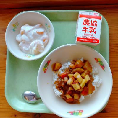 今日の献立は、「麦ごはん・牛乳・じゃがさんとさつまさんのカレー・フルーツヨーグルト」です。今日は「ふしぎなでまえ」というお話から飛び出した献立です。いもすけ団地に住むじゃがさんとさつまさんが出前をとるというお話です。でも、出前で届いたのはお皿だけ、結局自分たちが料理をすることになります。じゃがさんとさつまさんの作るカレーライスの上にじゃがさんとさつまさんをトッピングしました。