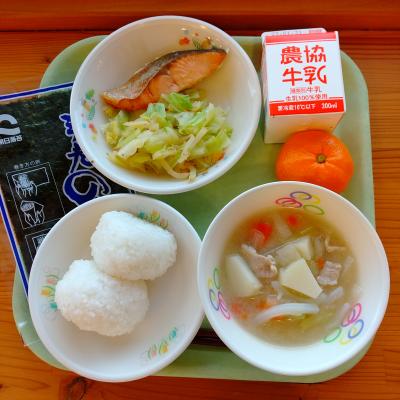 今日の献立は「おにぎり・牛乳・さけの塩焼き・つけもの・豚汁・みかん」です。今日から全国学校給食週間が始まりました。そこで、給食はじまり献立としておにぎりの給食を例年献立に取り入れています。