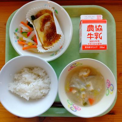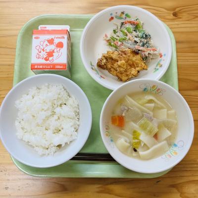 今日の給食は「ごはん・牛乳・とり天・あいまぜ・だんご汁」です。旅する献立として大分県の献立を取り入れました。