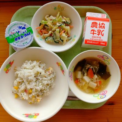 今日の献立は「中島菜チャーハン・牛乳・かに風味かまぼことキャベツのサラダ・白ねぎとわかめのスープ・河北潟ヨーグルト」です。能登の食材を使った給食です。能登中島菜は、漬物のように味つけされたものをチャーハンにしました。
