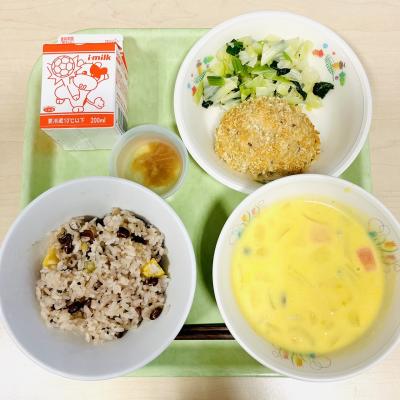 今日の給食は「五郎島金時と栗の赤飯・牛乳・ジビエ肉コロッケ・ハーブ香るベーコンほうれん草サラダ・体にしみるかぼちゃのまろやかスープ・つぶつぶ食感イチジクゼリー」です。