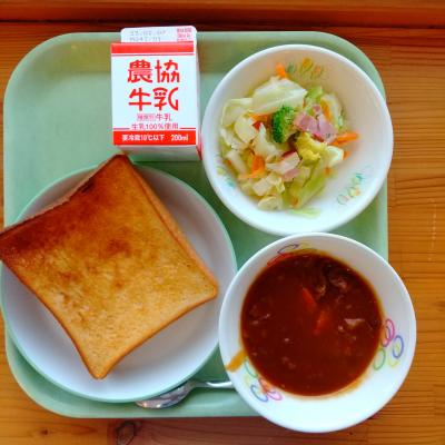 今日の給食は「メープルフレンチトースト・牛乳・ブロッコリーのサラダ・ビーフシチュー」です。トーストは、メープルシロップ、卵、牛乳、砂糖、バターを合わせたものに食パンを浸してからオーブンで焼きました。