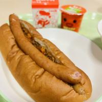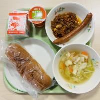 今日の献立は、「セルフチリドックパン・牛乳・野菜たっぷりスープ・やさいゼリー」です。自分で切れ目の入ったパンにチリコンカンとウィンナーをはさんで食べます。副菜は野菜たっぷりを意識しました。