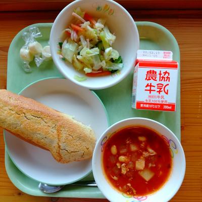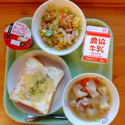 今日の給食は「クロックムッシュ・牛乳・ツナサラダ・ポトフ・デザート」です。