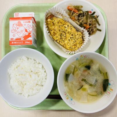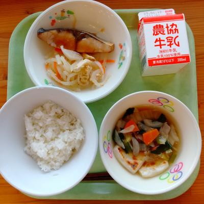 今日の献立は「ごはん・牛乳・魚のからしマヨネーズ焼き・細切り昆布の炒めもの・だいこんのみそ汁」です。