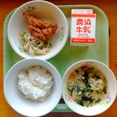 くれたようです。献立は「ごはん・牛乳・鶏肉のからあげはちみつ生姜醤油・ねぎしおナムル・ほうれん草のかきたまみそ汁」です。からあげは、みんな大好きですが甘辛いたれがさらにご飯がすすむ味で好評でした。