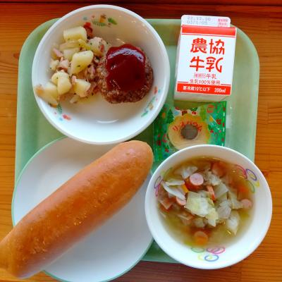 今日の給食は、旅する給食で「麦コッペパン・牛乳・フリカデレ(ハンバーグ)、ブラートカルトフェルン(ジャーマンポテト)、アイントプフ(野菜スープ)、デザートです。