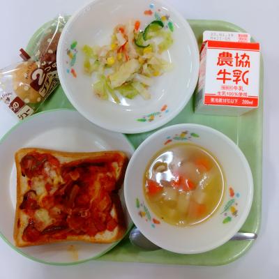 今日の給食は「ピザトースト・牛乳・ツナサラダ・ポトフ・デザート」です。今日は好評のピザトーストに加え、デザートがついたので、とても喜んでいました。デザートは給食のデザートらしくカルシウムや鉄がとれるものです。