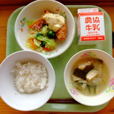 今日の給食は「ごはん・牛乳・チキン南蛮・ブロッコリーサラダ・じゃがいもとわかめのみそ汁」です。チキン南蛮は鶏の胸肉に衣をつけて油で揚げ、甘酢漬けて食べる前にタルタルソースをかけました。胸肉なので冷めてもやわらかく、タルタルソースは給食室で手作りしたもので、とてもおいしかったです。