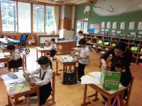 2年生 国語プリントをしています。絵本のリーフレットをつくりました。