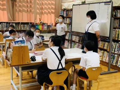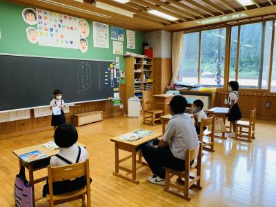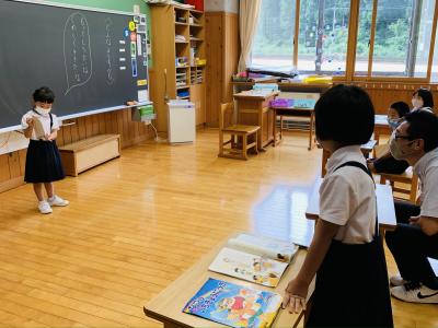 国語 夏休みの思い出を発表しています。話の内容を想像しながら聞いています。