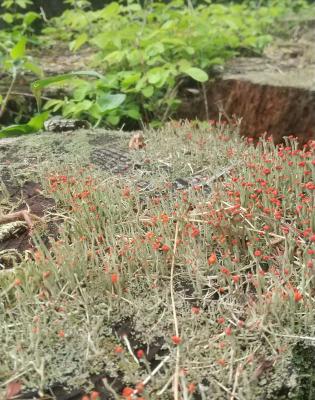 グランド裏の切り株にコアカミゴケという菌類と藻類の仲間の地衣類が群生しています。