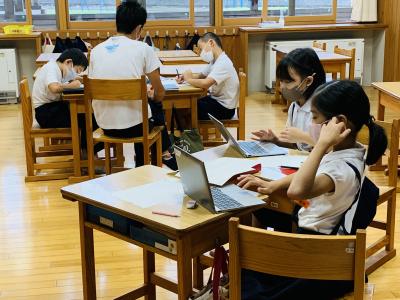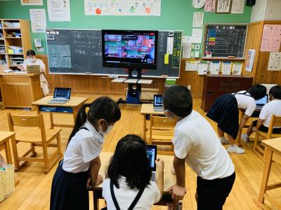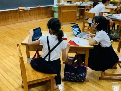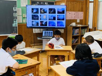 端末を使って夏の思い出を撮影した宿題を皆で共有しています。