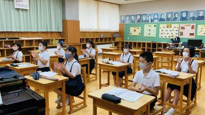 その後、中学校は各教室で、小学校は集会で、感染症対策や生活、学習について聞いています。