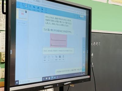 社会 白峰牛首つむぎと九谷焼美術館に行った際に、どんなことを聞くのか、学ぶのかを話し合っています。歴史や作り方について聞きたいという意見が出されています。