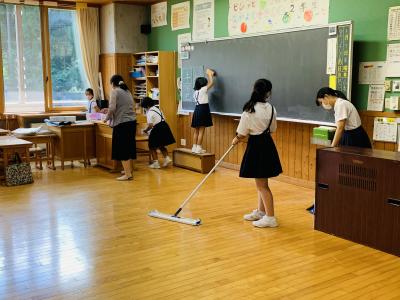 黙々清掃 今日から縦割り清掃を再開しています。おしゃべりをせず、黙々と行っています。