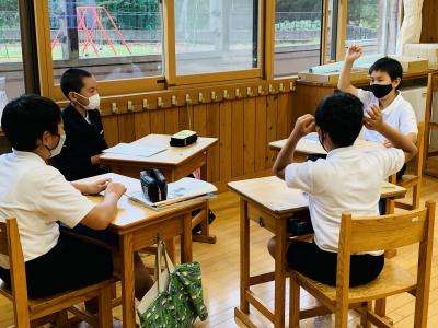 国語 「やまなし」という作品名がついた理由について意見交換しています。
