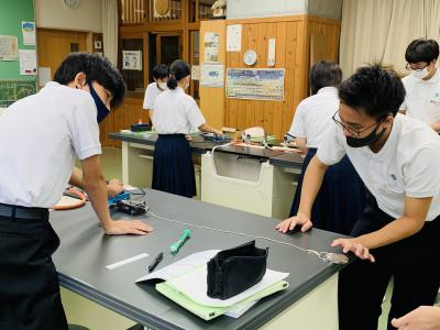 理科 電流と磁界について学習しています。電流や磁界は目に見えにくいので、コンセントなど生活体験と繋げて学んでいます。
