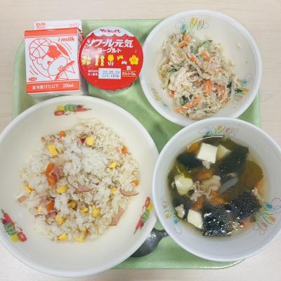 今日の給食は「五目チャーハン・牛乳・バンバンジーサラダ・豆腐とわかめのスープ・ヨーグルト」です。