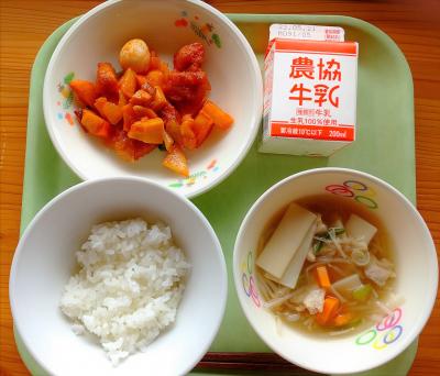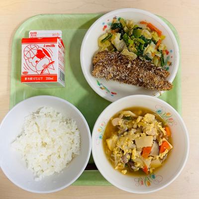 今日の給食は「ごはん・牛乳・いわしのアングレーズ・ごまあえ・高野豆腐の卵とじ」です。