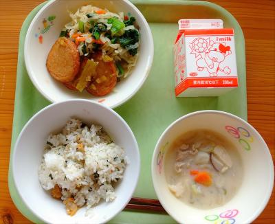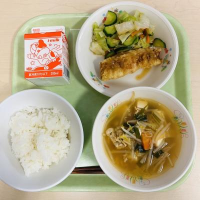 今日の献立は「ごはん・牛乳・ホキのから揚げ薬味ソース・ナムル・キムチスープ」です。ホキは白身の魚で、揚げるとホクホクしてとてもおいしいです。キムチスープにはキムチ漬けを入れて作ったので、少し辛かったかもしれ