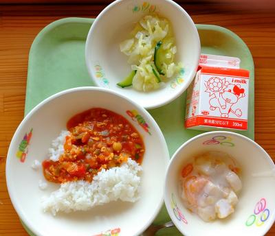 旅する給食(インド)メニューでした。いつものカレーとは少し変えて、ひよこ豆やトマト缶をたっぷり入れ、