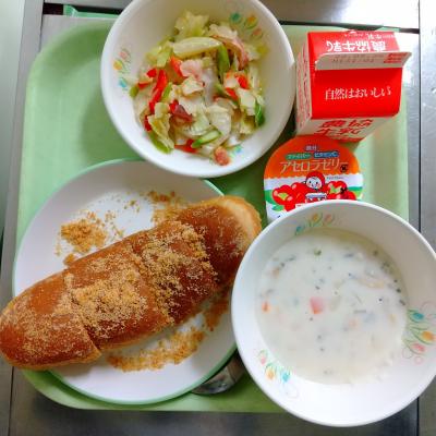 今日の給食は「きなこあげパン・牛乳・カリカリベーコンとアスパラのサラダ・クラムチャウダー・アセロラゼリー」です。給食の中でも人気があるのは、揚げパンです。今日は、おまけのパンがあり、調理員さんが1/4にカットしてくれました。おかわりの希望者が多く、すっかりきれいに食べてくれました。