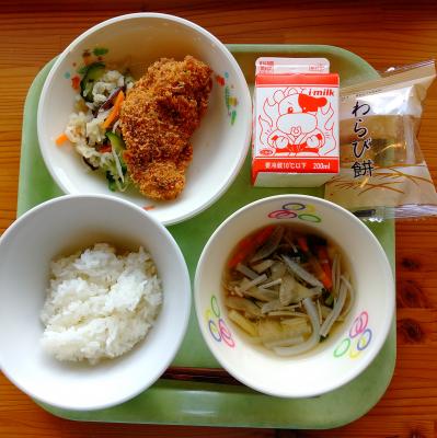 今日の給食は「ごはん・牛乳・鶏肉のかわりあげ・あちゃらづけ・沢煮椀・わらびもち」です。今日の給食は絵本の献立で、本は「3年7組食物調理科」です。高校卒業と同時に調理師免許がとれる食物調理科の絶品料理を目指して実習を重ねる物語です。その中の和食の献立を給食に取り入れました。