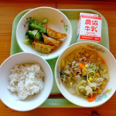 今日の献立は「麦ごはん・牛乳・ギョウザ・ブロッコリーの中華あえ・みそラーメン」です。みそラーメンはめんが伸びないように汁とは別々に出しています。また、みそラーメンの日はごま油でねぎ、にんにく、しょうがを炒めみそも炒めて「みそ玉」という調味料を手作りします。ブロッコリーの中華あえにもニンニクを入れたので、ニンニクたっぷり献立になってしまいました。